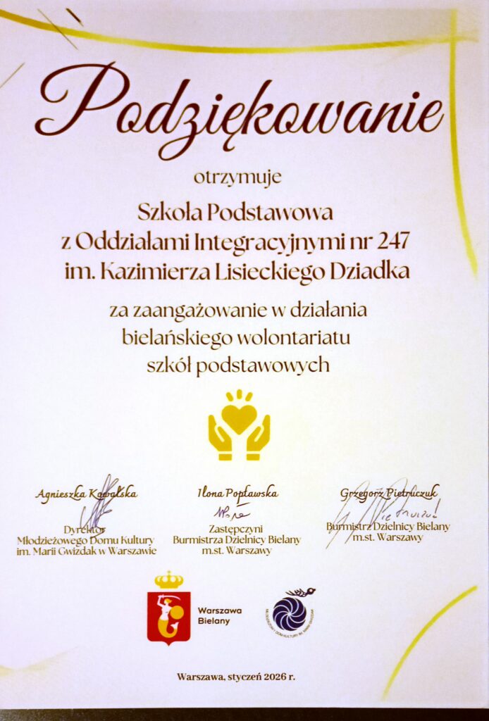Wolontariat SP 247 został wyróżniony za swoją działalność.
